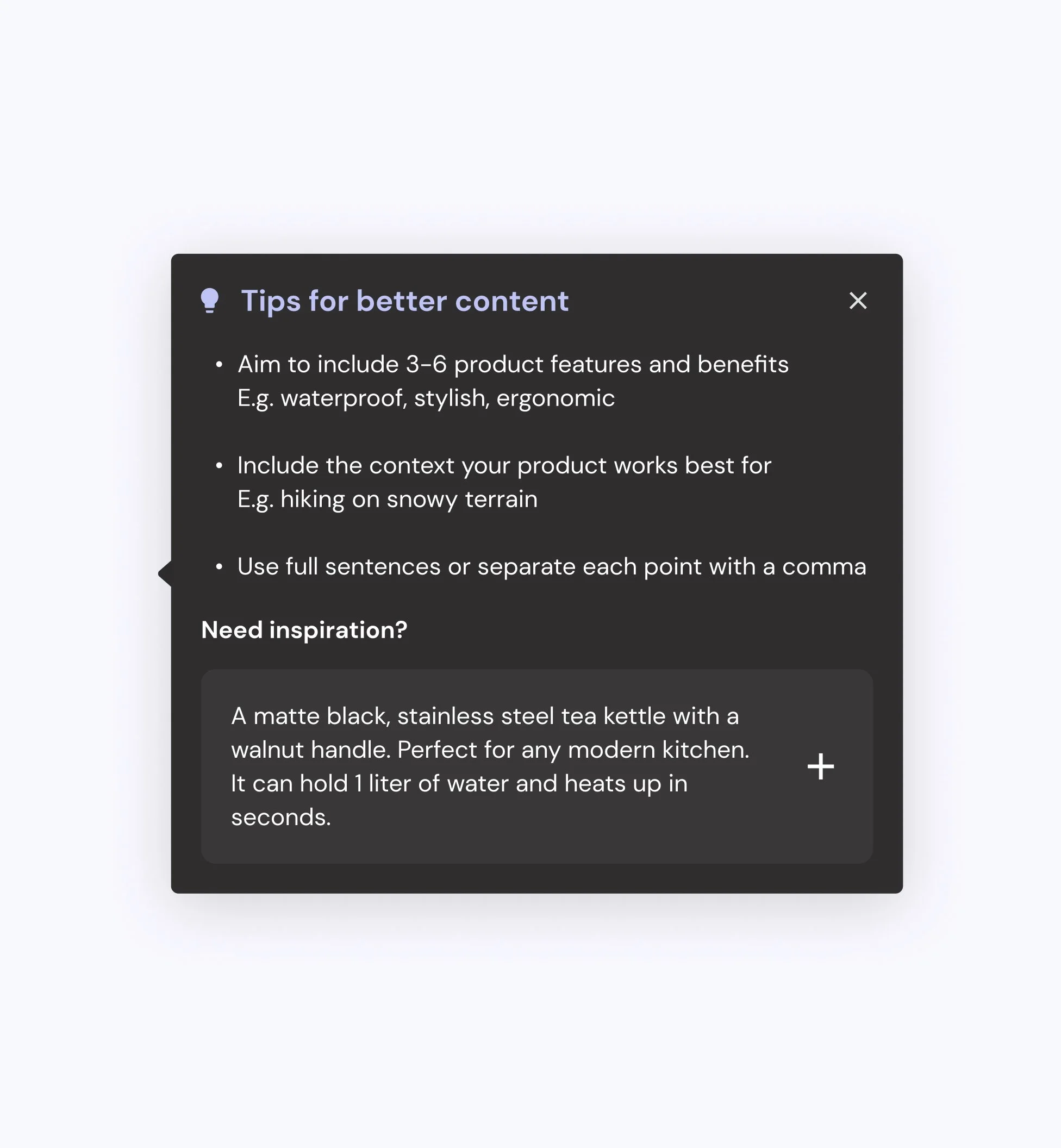 I designed a Tips element to help people craft effective prompts for each use case. It consisted of helpful info and an example users could add directly to their input to experiment with.