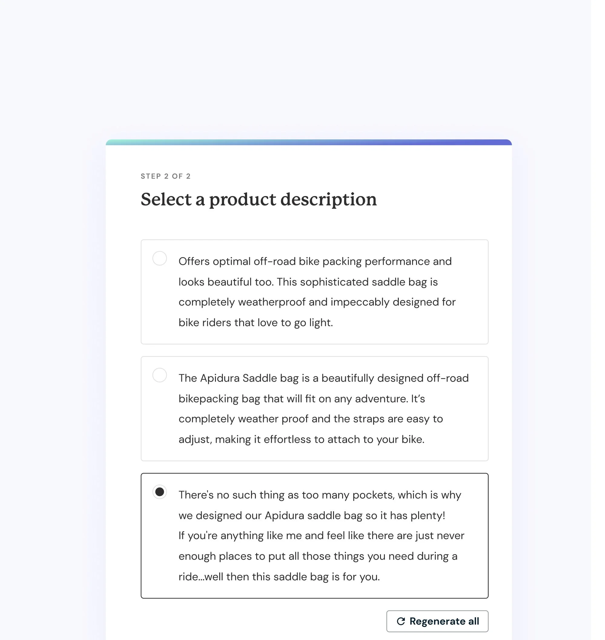 Since most users would be new to AI, I wanted to ensure the templates’ experience felt guided and approachable. To accomplish this I used clear, action-based UX writing, an easy-to-follow step-by-step process and familiar elements like form inputs. Colour and UI transitions were added to create a sense of ease and friendliness.